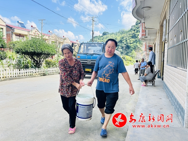 7月21日,再見到張世軻時,他正忙著給村里的群眾送水,受強降雨影響,該村的供水工程管網(wǎng)和設(shè)施沖毀受損,鎮(zhèn)上組織了送水車解決村民用水問題。對于行動不便的群眾,張世軻主動幫助接水,并送水到家。