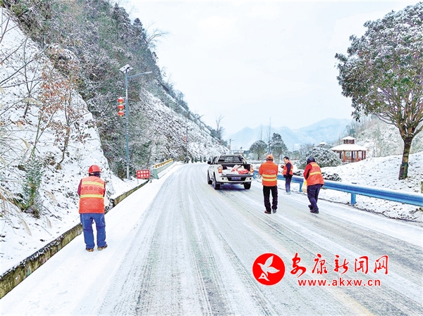 養(yǎng)護(hù)道工在G541國(guó)道柏枝埡隧道洞口附近拋灑融雪劑 劉翔 攝