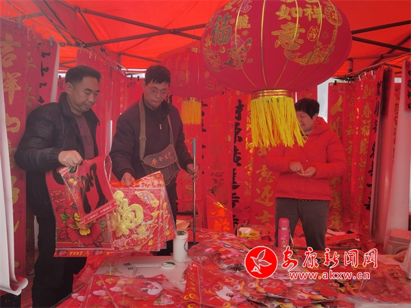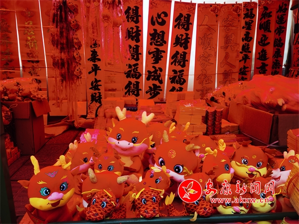 攤主劉女士說(shuō):“雖然今年過(guò)年時(shí)間比較晚,但是我們的年貨已經(jīng)早早備齊了,最近大家買對(duì)聯(lián)的熱情高漲,在新的一年祝愿大家龍年行大運(yùn)、發(fā)大財(cái),龍年吉祥。”