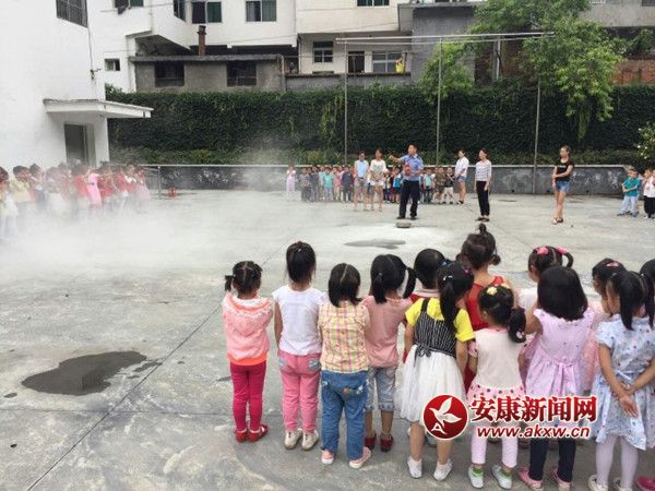 6月30日中午10時許,消防演練活動準時開始。隨著一陣急促的警報聲響起,按照消防預案,全園學生在老師的帶領下,嚴格按照消防演練講解示范,低頭捂嘴,快速疏散到操場上,整個過程僅用2分鐘左右。消防演練的第二個階段是指導全校老師使用消防器材,民警首先給做示范、做講解,然后教師依次使用滅火器對著假火堆進行滅火訓練。