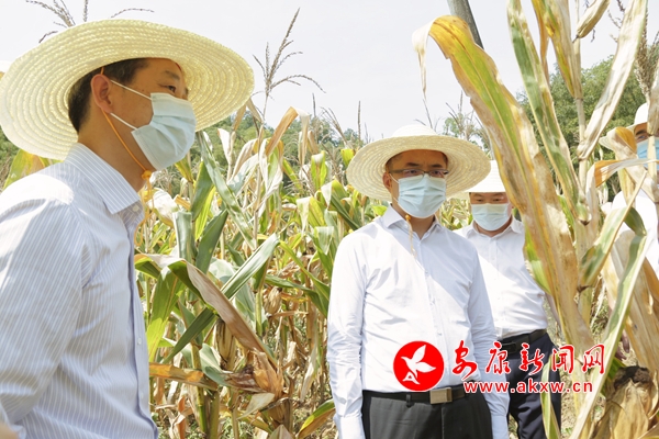 王浩(左二)在關(guān)廟鎮(zhèn)黃嶺村玉米大豆復(fù)合種植示范點(diǎn)檢查作物長(zhǎng)勢(shì)和抗旱保灌情況