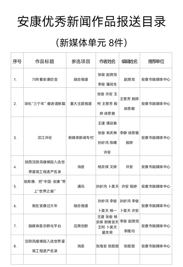 根據(jù)《關(guān)于開(kāi)展2024年度安康優(yōu)秀新聞作品、安康市優(yōu)秀新聞工作者推選工作的通知》(安記協(xié)〔2025〕04號(hào))文件要求,經(jīng)推薦、領(lǐng)導(dǎo)審核,安康市融媒體中心推薦參評(píng)2024年度安康優(yōu)秀新聞作品97件(報(bào)紙單元58件,廣播電視單元31件,新媒體單元8件)。現(xiàn)將報(bào)送作品目錄(詳見(jiàn)附件)予以公示。