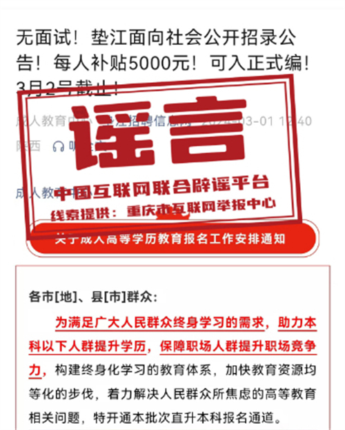 真相:近日,“墊江招聘信息網(wǎng)”微信公眾號(hào)發(fā)布信息:“無(wú)面試!重慶墊江面向社會(huì)公開(kāi)招錄公告!每人補(bǔ)貼5000元!可入正式編!”部分網(wǎng)民看到該信息后誤認(rèn)為,墊江面向社會(huì)以補(bǔ)貼形式招錄具有正式編制的公務(wù)人員,于是紛紛向墊江縣有關(guān)部門致電咨詢招錄情況。經(jīng)核實(shí),近年來(lái),墊江未曾以補(bǔ)貼方式和不經(jīng)過(guò)面試招錄具有正式編制公務(wù)人員。該信息實(shí)則為成人學(xué)歷提升培訓(xùn)信息,而非正式編制公務(wù)人員招錄信息。墊江縣互聯(lián)網(wǎng)信息辦公室已依法對(duì)發(fā)布該信息的微信公眾號(hào)負(fù)責(zé)人進(jìn)行約談和教育批評(píng),指出虛假信息的危害性,并責(zé)令刪除相關(guān)信息。(來(lái)源:重慶辟謠)