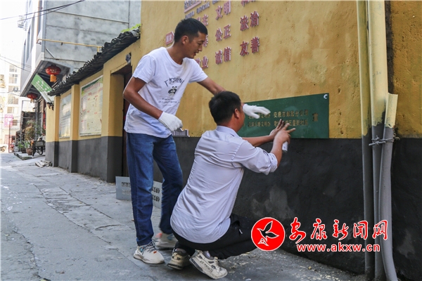 7月21日, 城區(qū)五星街社區(qū)組織人員,對五星街的背街小巷進(jìn)行清理,粉刷墻面,書寫標(biāo)語。(李春江)