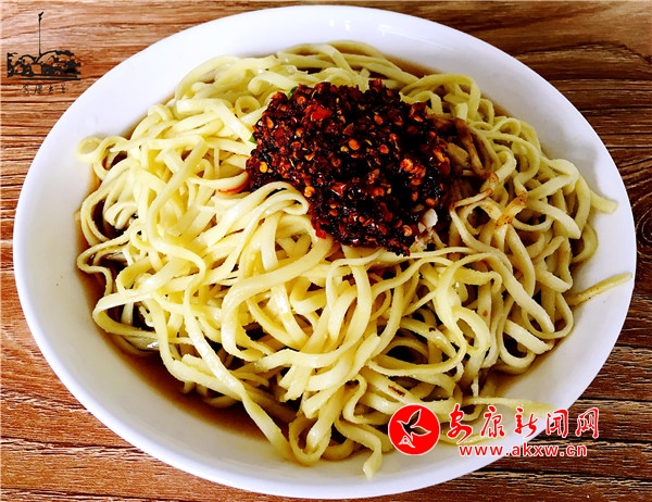 在恒口,涼面作為大眾面食,家里來了客人,主婦都會做涼面招待。搟一案子面,切成筷子寬的長條,下鍋煮開就撈,滴上香油,快速挑起用扇子扇涼,配上幾個可口的素菜就齊活了。醋湯、油潑辣子、青辣大蒜,還有花生碎。雖然調(diào)料不多,但每一樣都很講究。醋汁需用十幾種大料熬制,要保證每次熬出的醋湯味道一致,大料要精確比例。油潑辣子要選用上等干辣椒,炕干再配上調(diào)料打碎。每一樣精心調(diào)制的配料要達(dá)到色香味俱全,構(gòu)成了傳統(tǒng)涼面的精髓。
