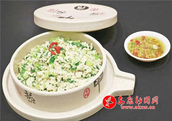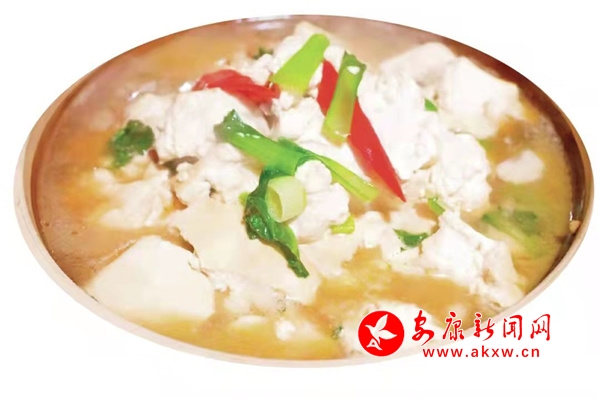 以石磨豆腐、小青菜為主要食材,制作時首先把豆腐捏碎,然后把青菜切成碎,在豆腐里面加入一個雞蛋,攪拌均勻。起鍋燒豬油下入蒜末炒香,倒入青菜、豆腐、炒熱,然后調(diào)味,在配上一小碟提前準備好的大蒜辣椒,吃著既有豆腐的醇香,又有青菜的清淡,營養(yǎng)價值也很較高。