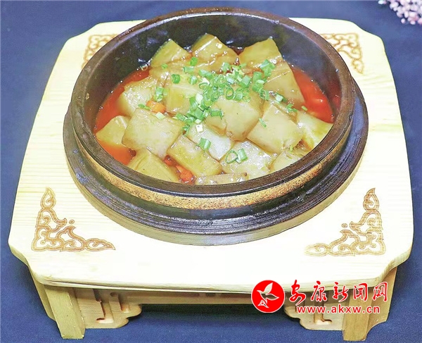 石鍋涼粉選用安康本地種植紅薯磨制的粉面,用水稀釋,起鍋燒水,等水燒開后,把稀釋好的紅薯粉倒入鍋中,順著一個方向攪拌,等到攪拌濃稠、顏色變青,倒入托盤放涼,做成涼粉。然后把石鍋加熱,在燒油鍋中放入小米椒圈 、五花肉粒爆炒,加入豆瓣醬、火鍋底料和少量清水,再倒入涼粉,調(diào)味加熱,打入薄欠即可。石鍋涼粉香辣可口、涼粉軟糯、非常下飯。