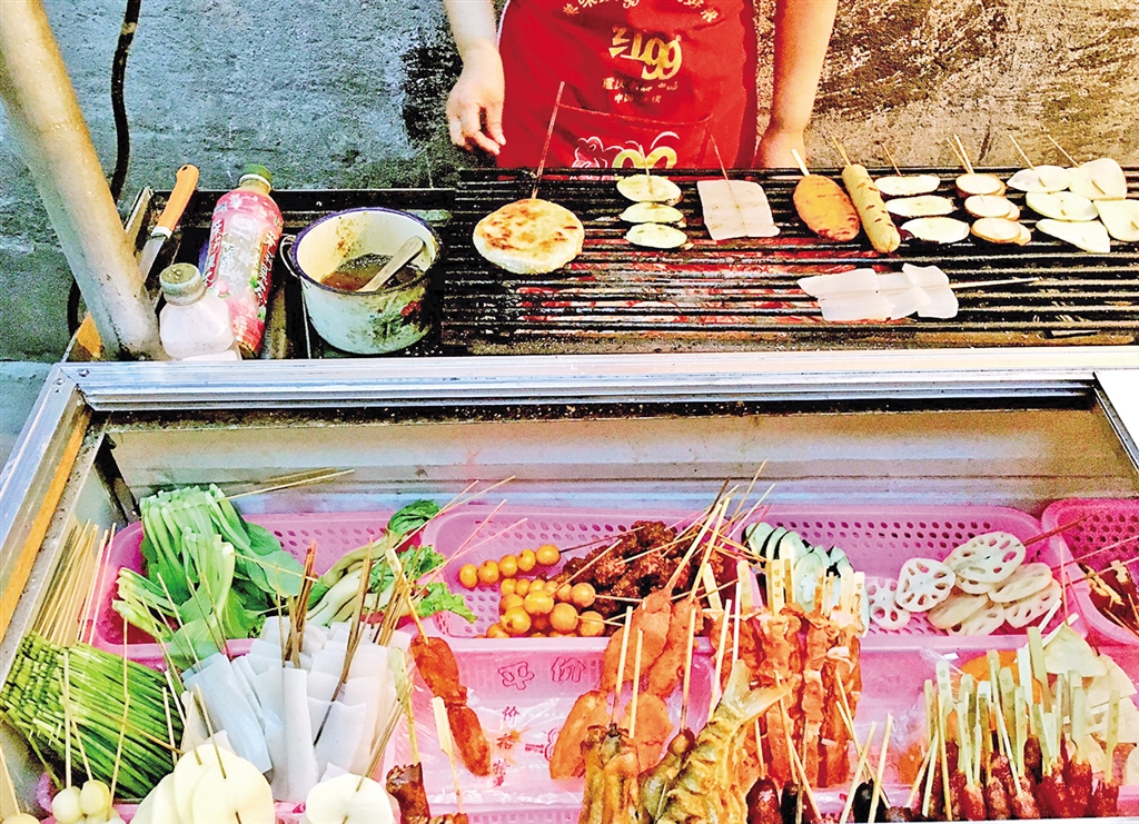 鐵簽子穿上各式各樣的菜,與多種調(diào)味料共同在炭火的作用下,由生變熟、由平淡向多滋多味轉(zhuǎn)變。辣子、花椒、孜然、芝麻、五香面等各種香料、調(diào)味品的通力配合,賦予了普通蔬菜別樣的生命和內(nèi)涵。